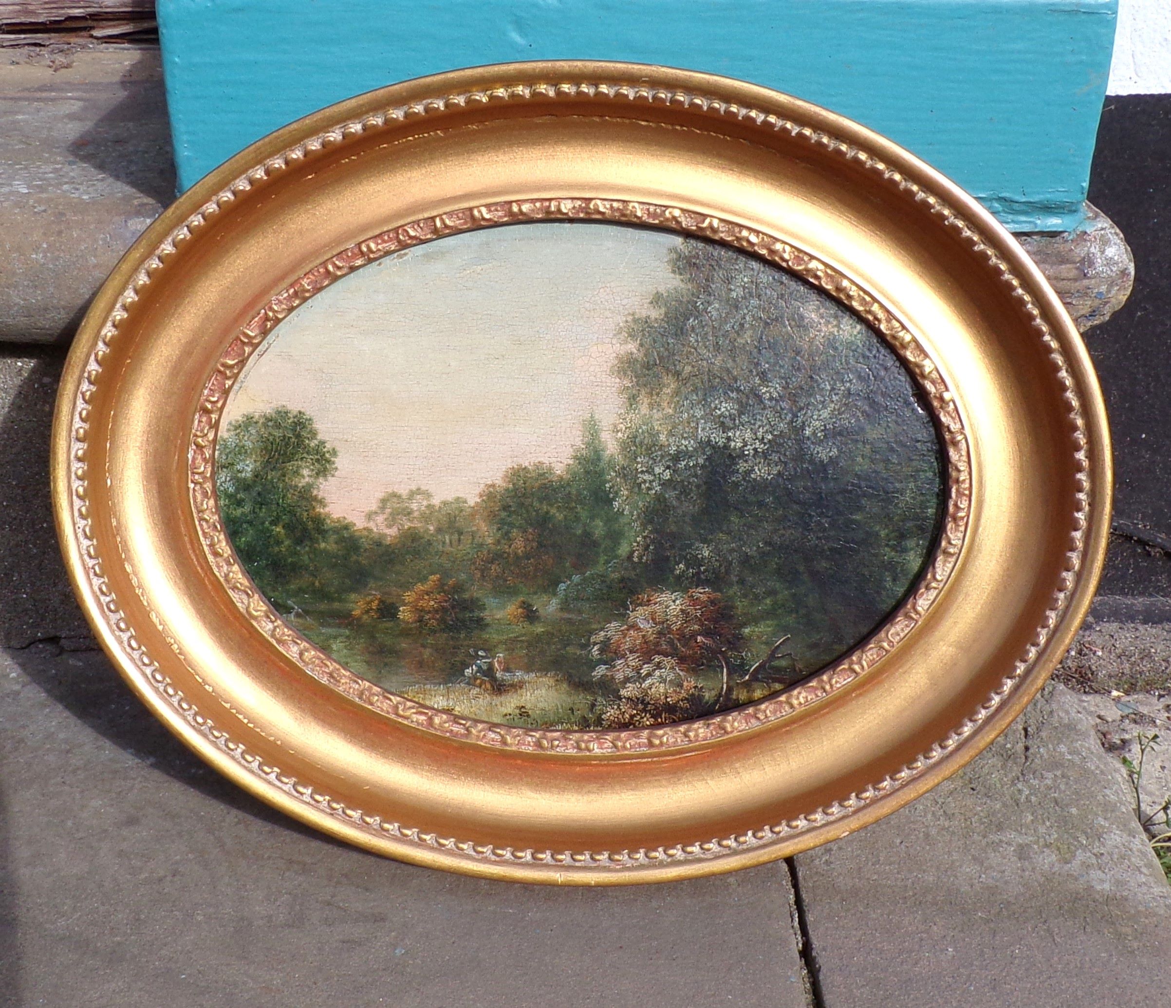 18th / 19th Century finely detailed oval oil on oak panel – Classical landscape with two figures, possible feint monogram “RSS”