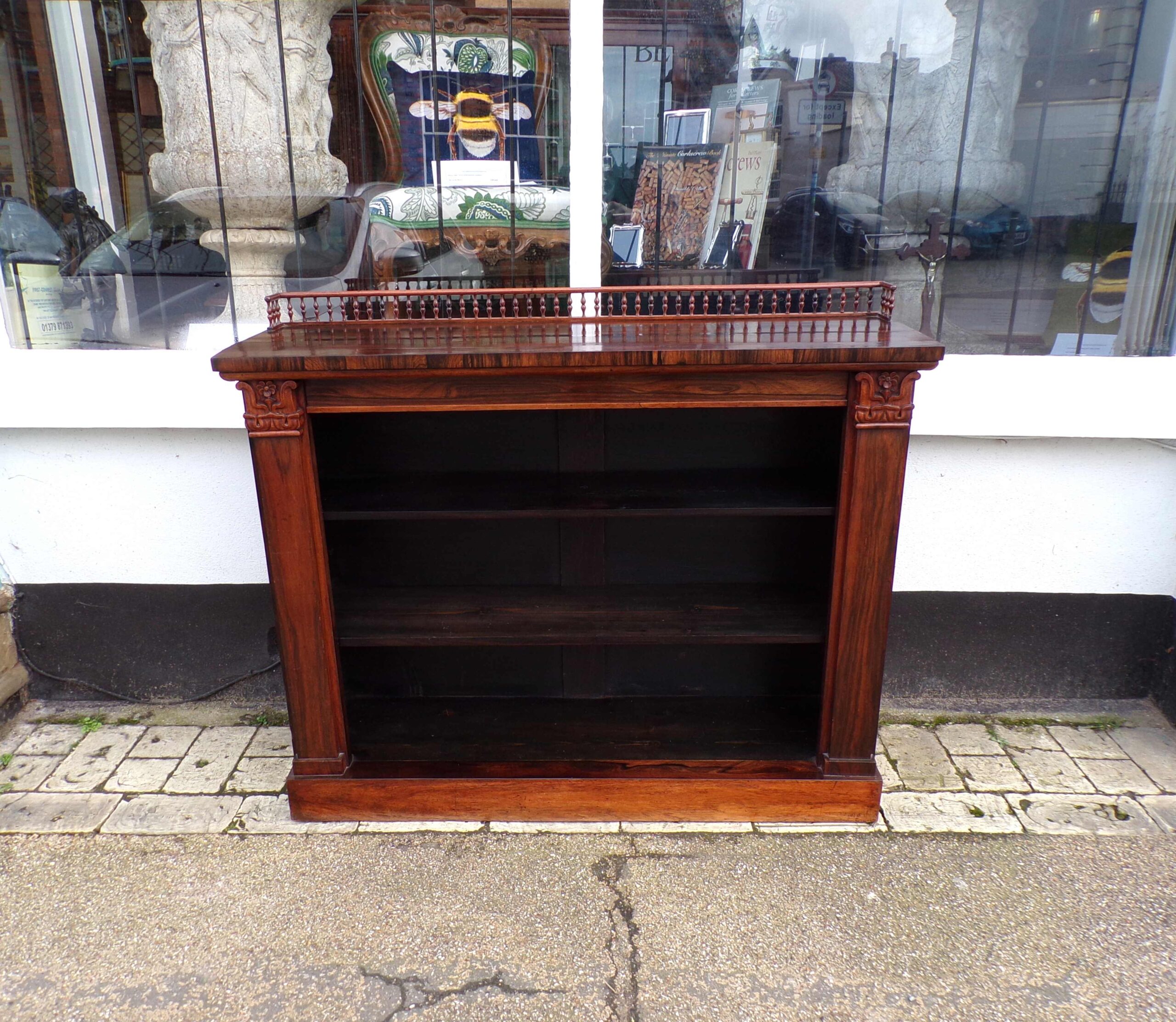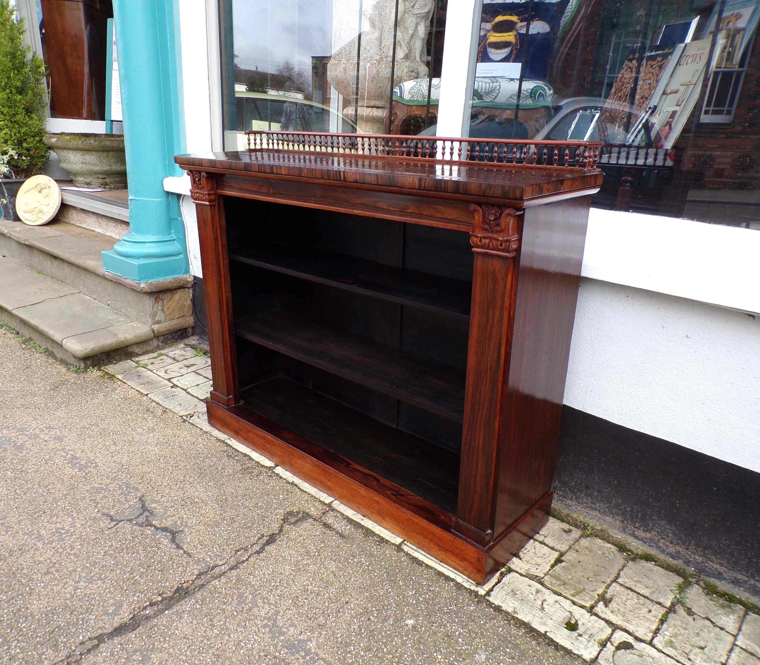 19th Century good quality nicely grained rosewood open bookcase with acanthus leaf pilasters and turned gallery upstand