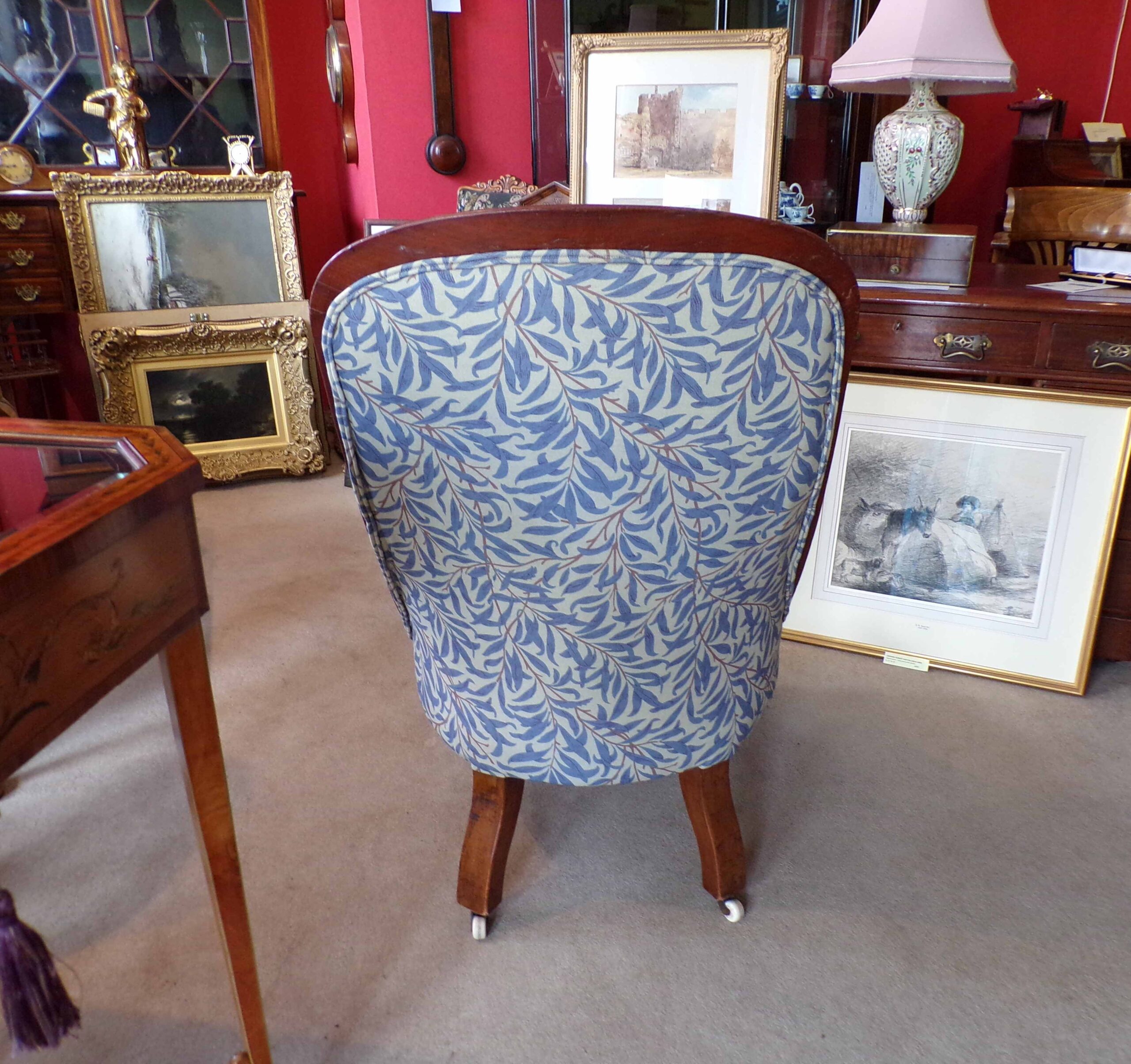 A Victorian mahogany deep buttoned back small occasional chair re-upholstered with double-piped William Morris leaf scroll