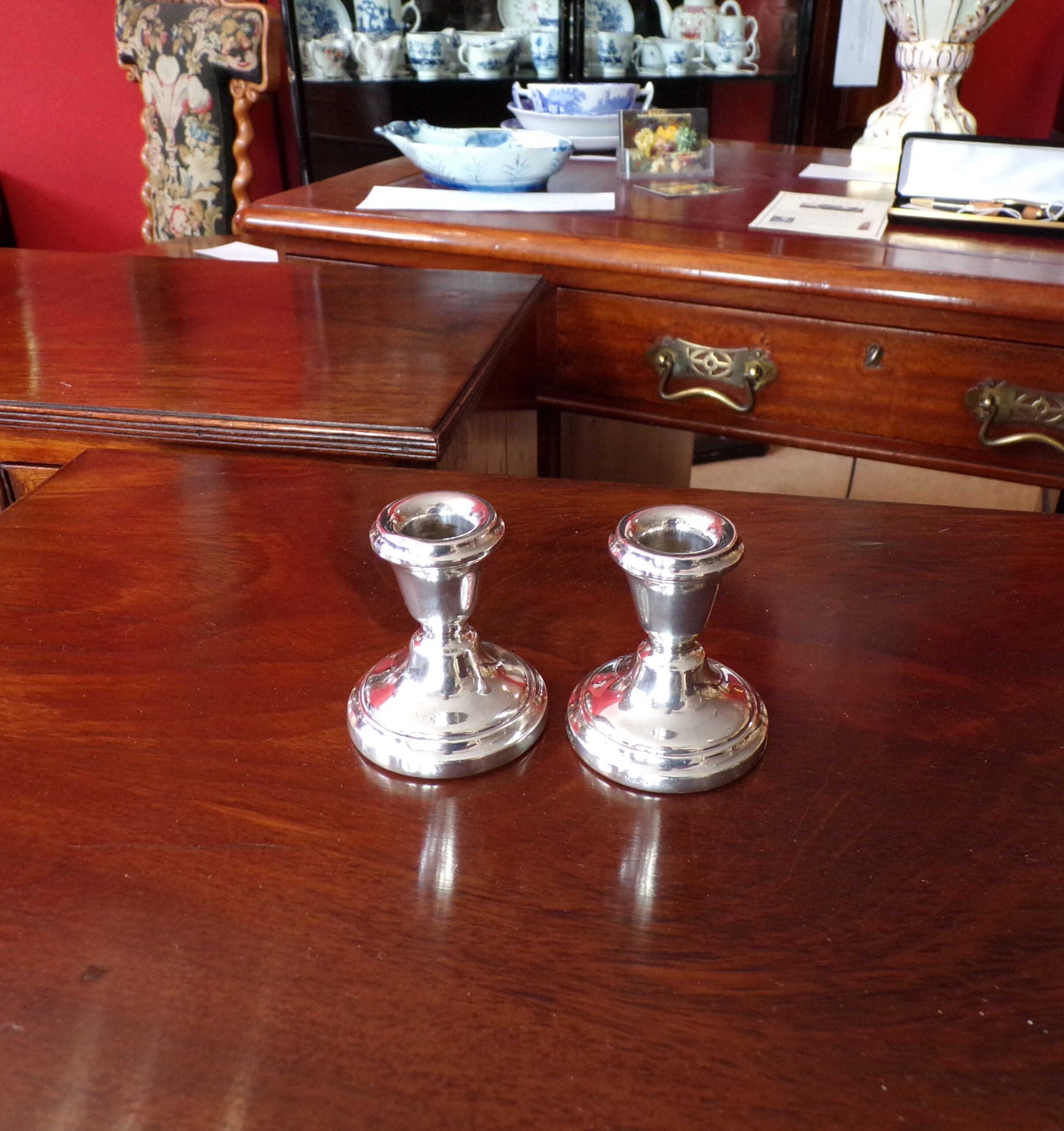Pair of Birmingham sterling silver weighted squat candle holders