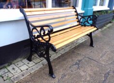 Fully re-furbished in black cast iron vintage garden seat with maple stain wooden slats
