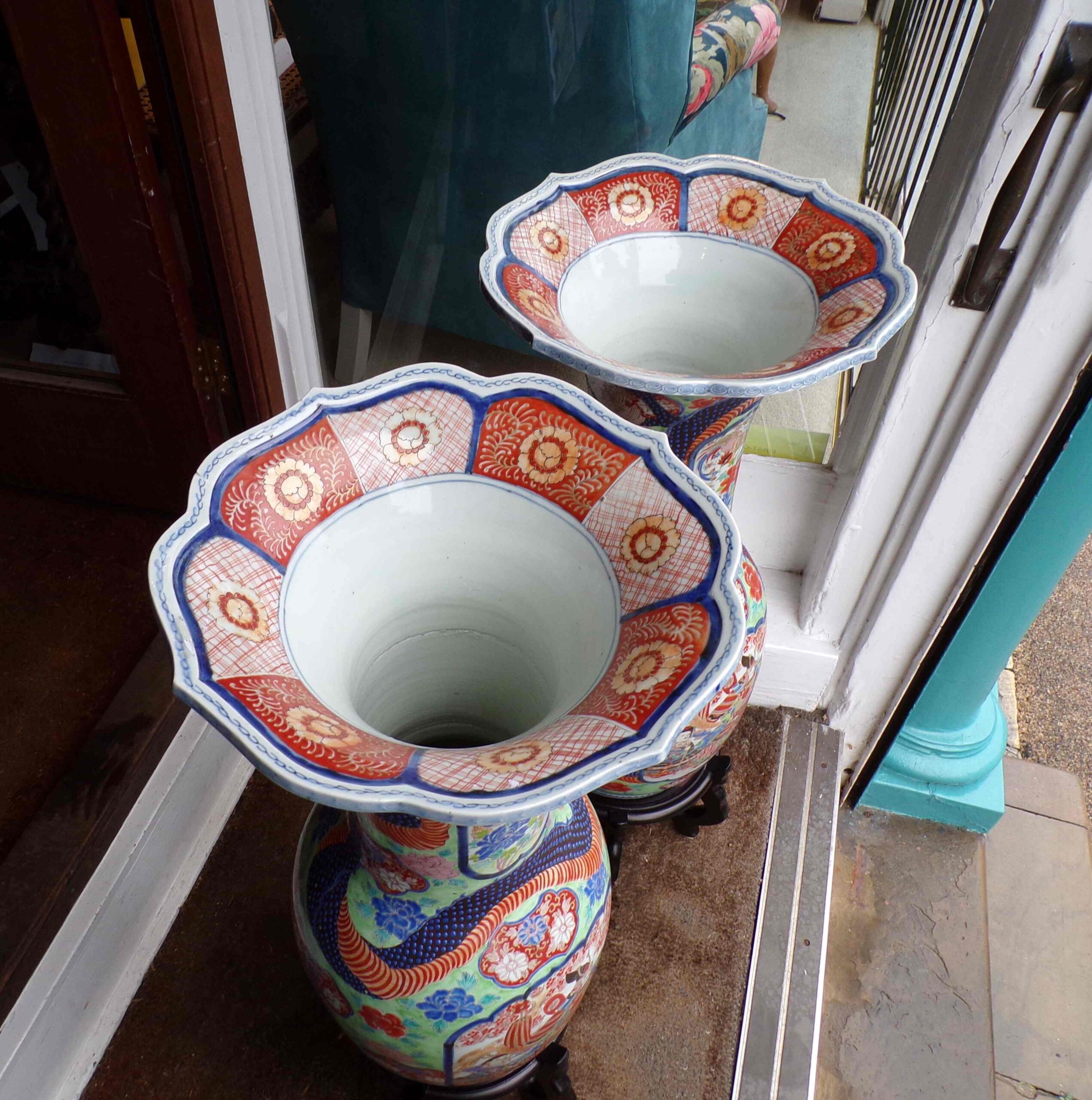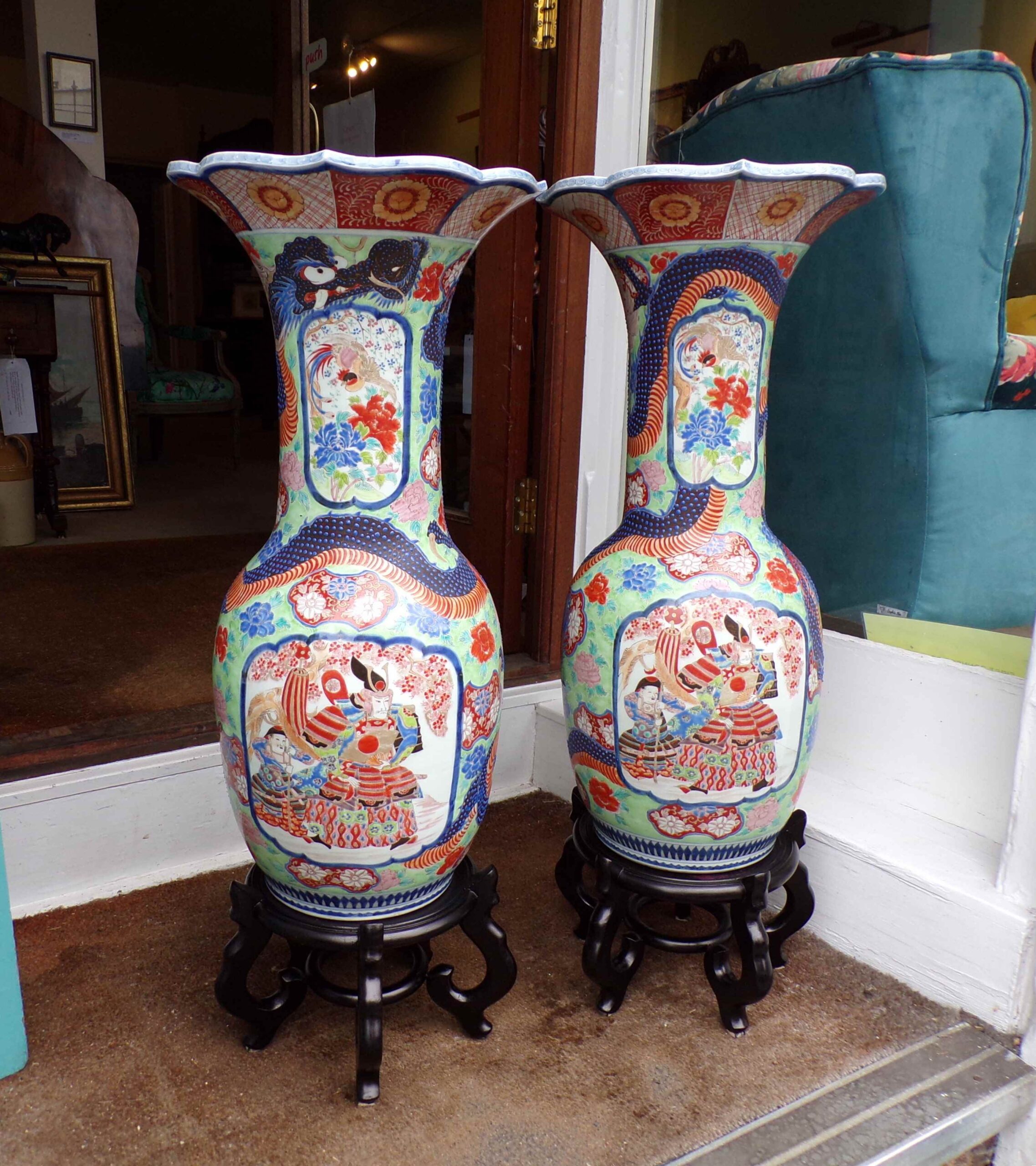 A pair of exceptional Mid-Late 19th Century floor vases, Circa Late Edo – Meiji period decorated with Samurai & dragons, interestingly left & right handed, bearing the merchants motif Tashiro Monzaemon, Arita