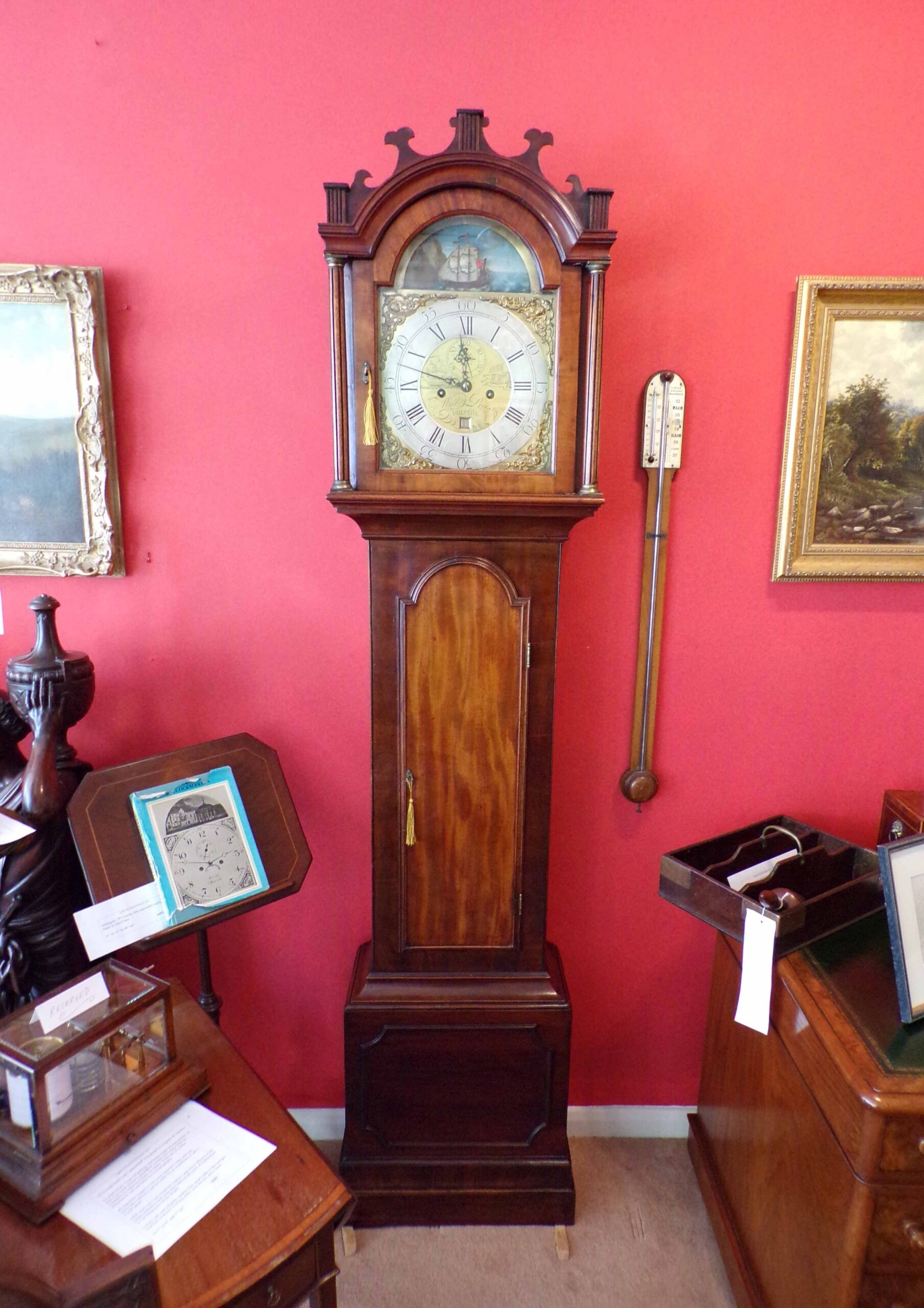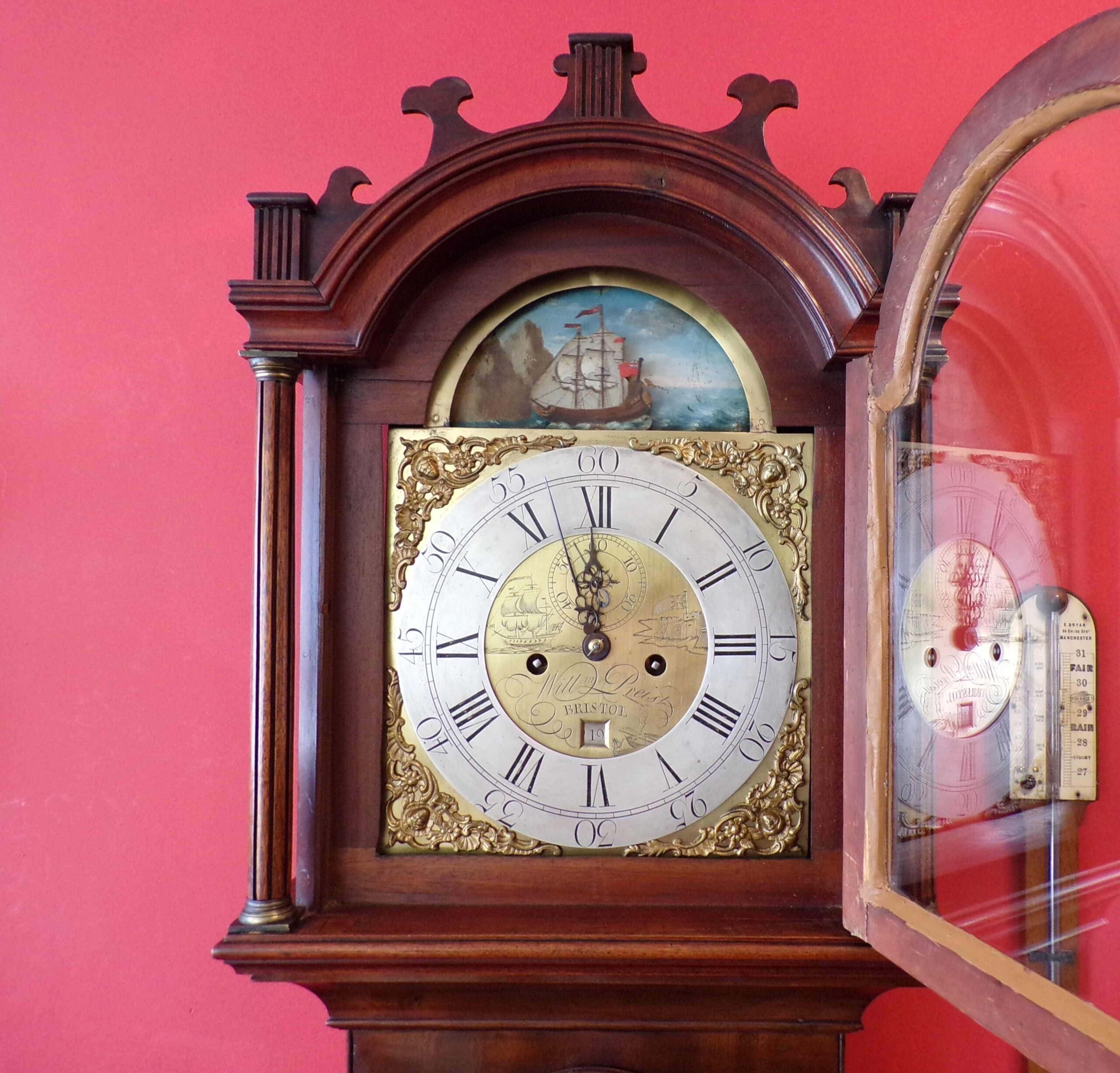 A superb and rare Late 18th Century Georgian figured mahogany longcase clock with automaton arch and rocking ship, eight day movement striking the Hours on a sweet bell by WP. William of Bristol Circa 1775