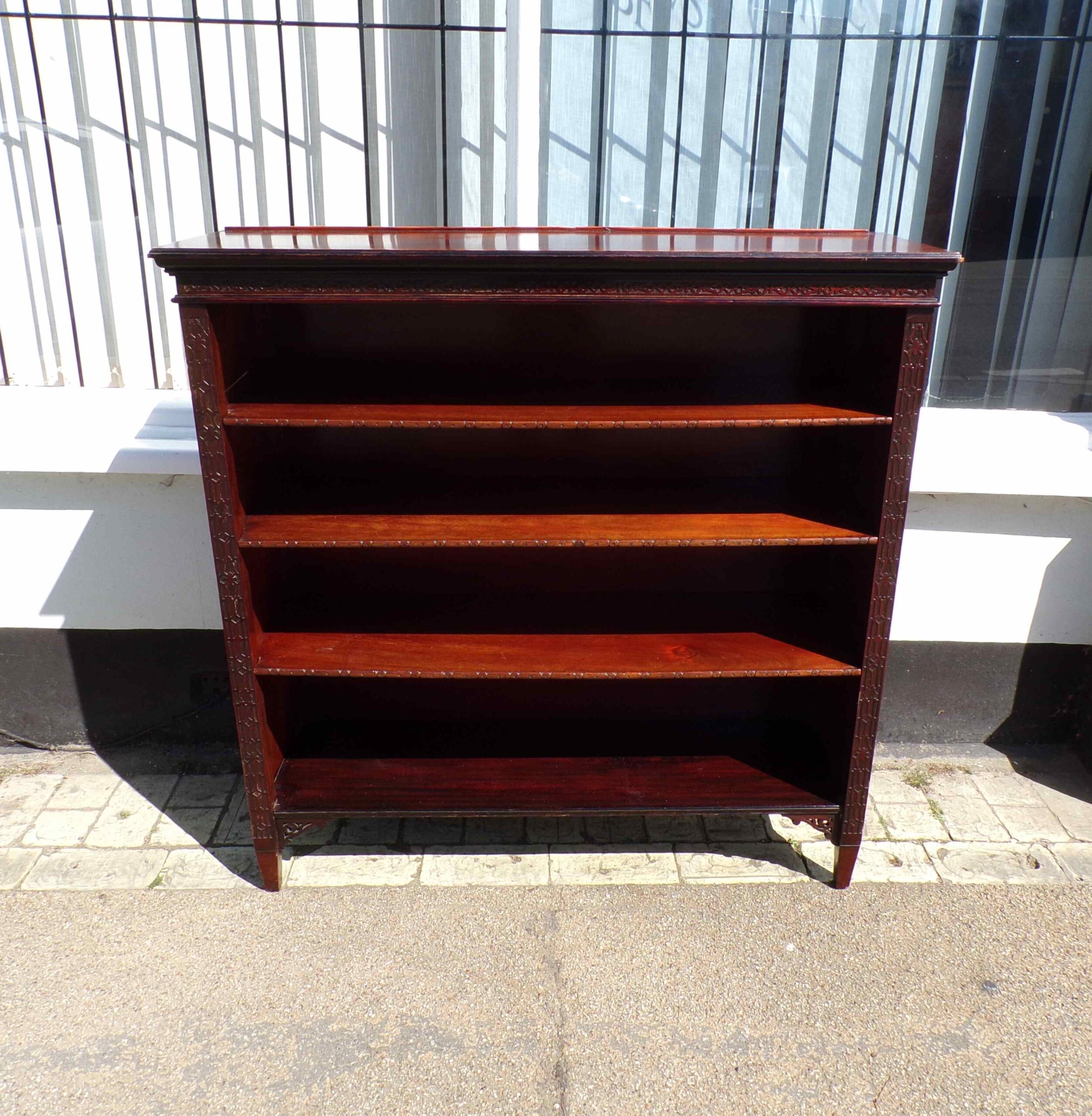 Antique mahogany open bookcase with blind carved fret decoration Circa 1890