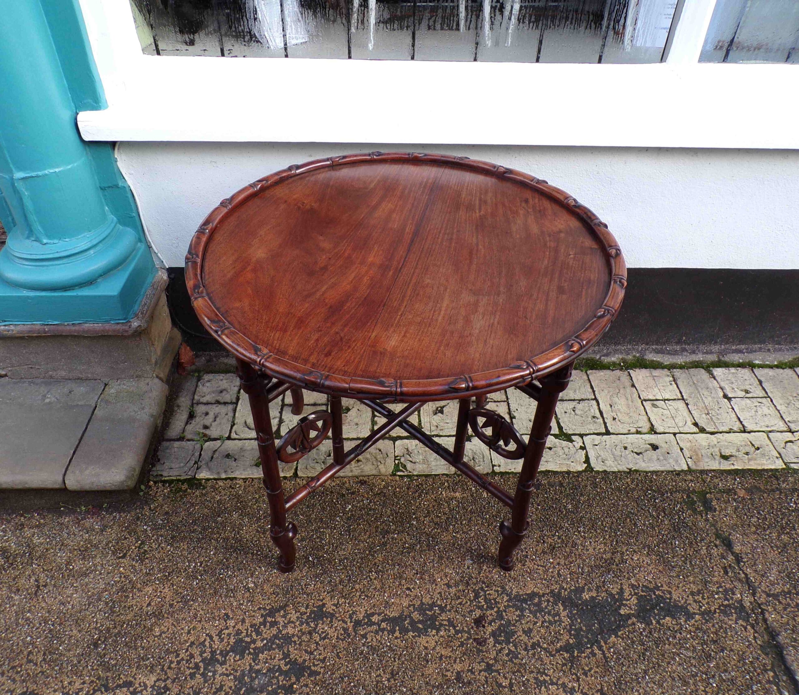 An antique “Benares” folding table, with a turned wooden base and nicely worked top