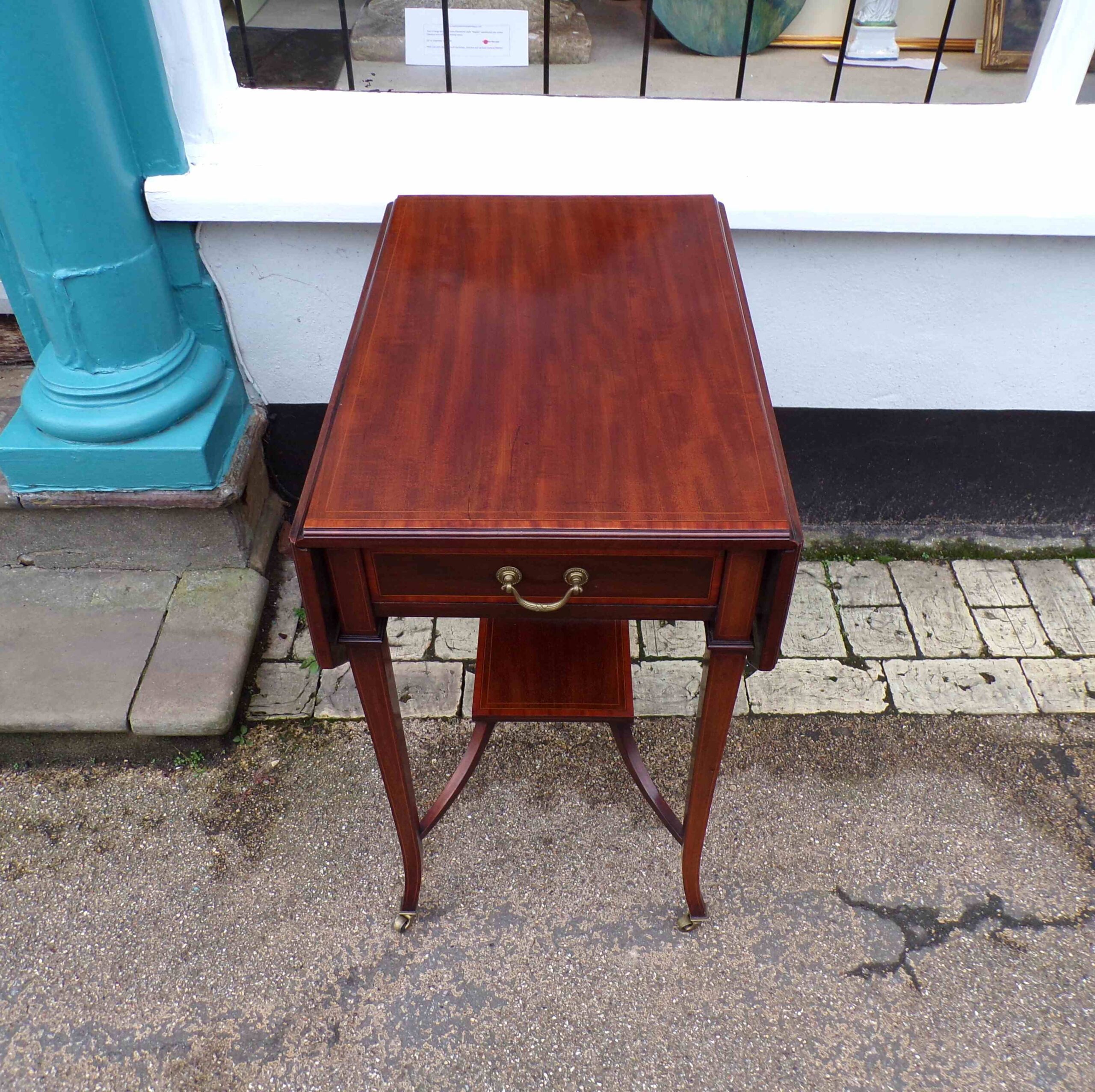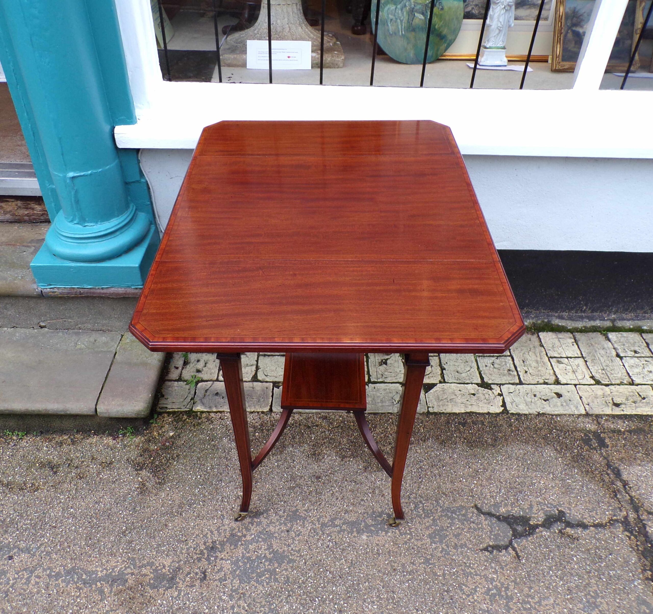 Edwardian mahogany inlaid swivel flap top “Pembroke” table with single drawer, canted corners and swept supports, banded in satinwood