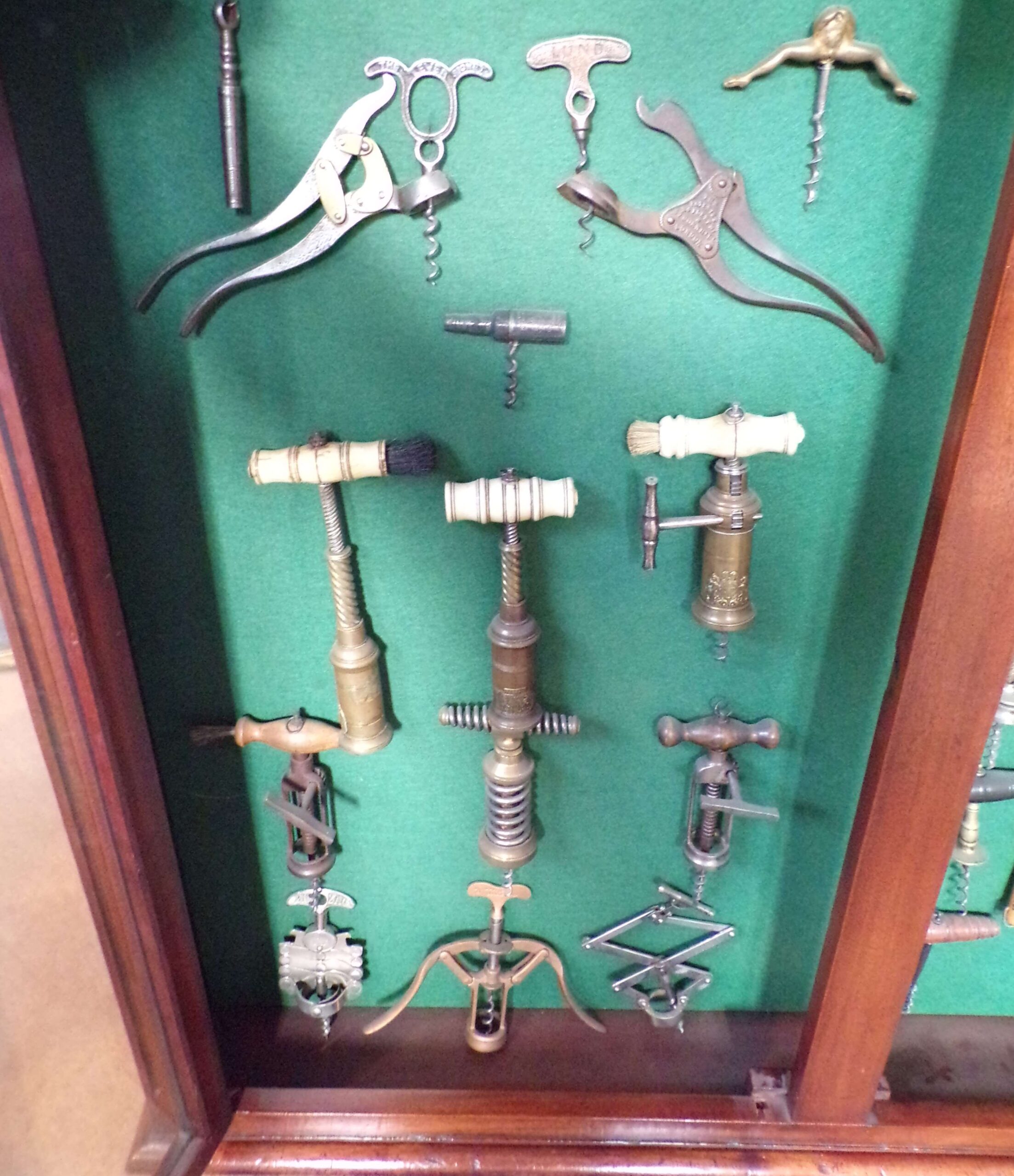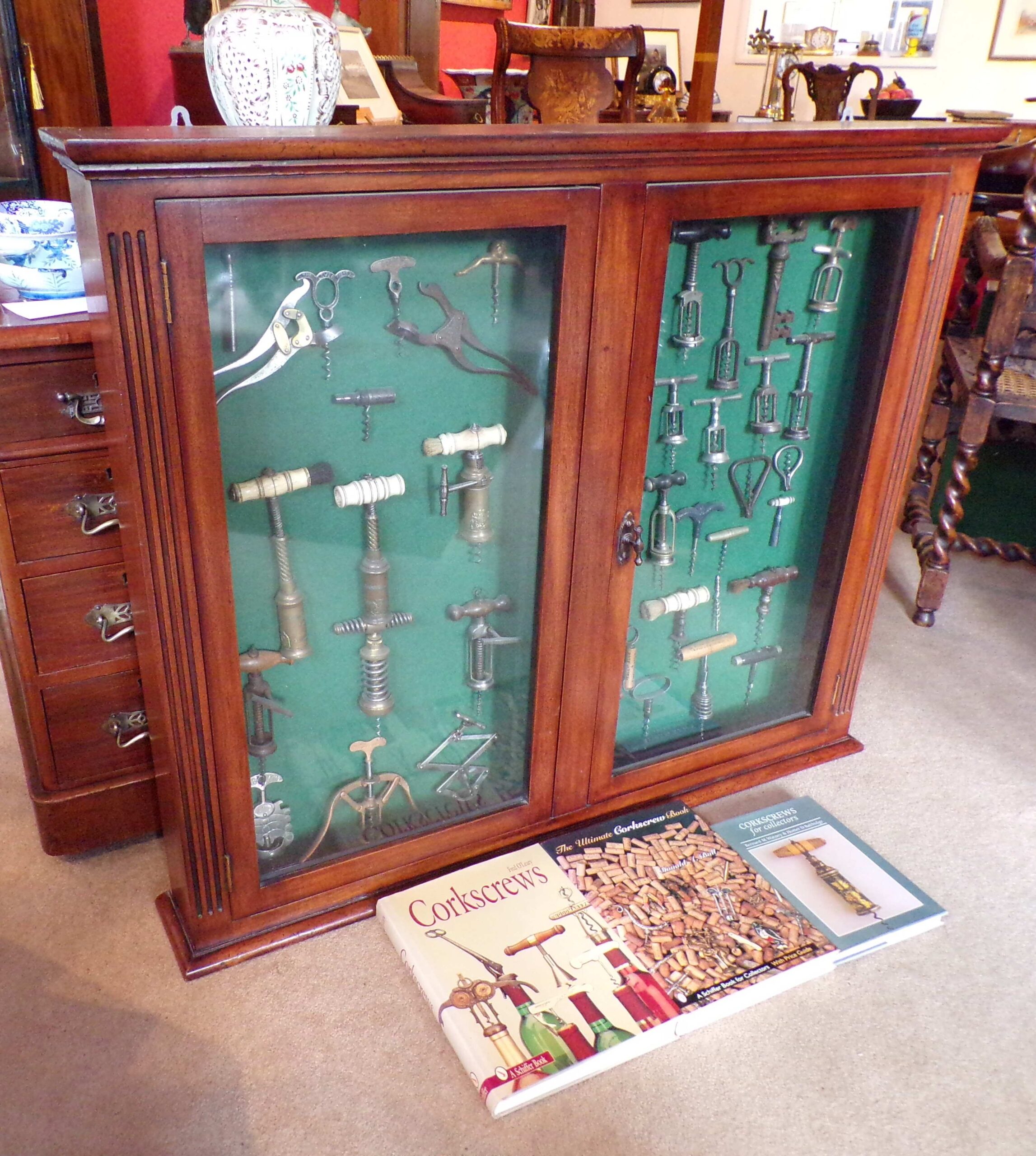 Wine collecting interest: Fantastic large private collection of antique cork screws, hand mounted within their purpose made glazed wall mounted display case including specialist books on the subject