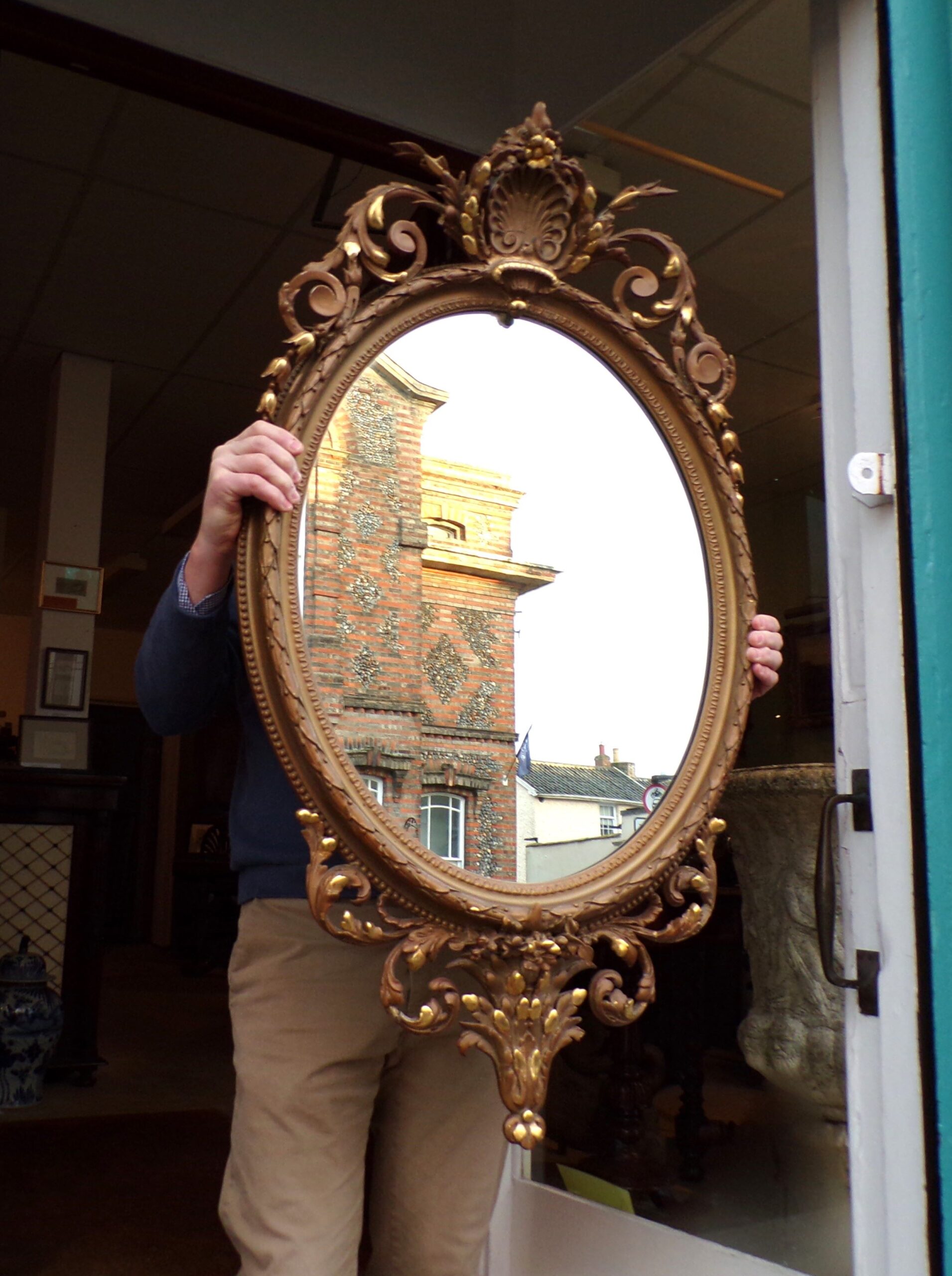 Large antique gilt oval wall mirror with gilded highlights, the cornice with shell foliate decoration