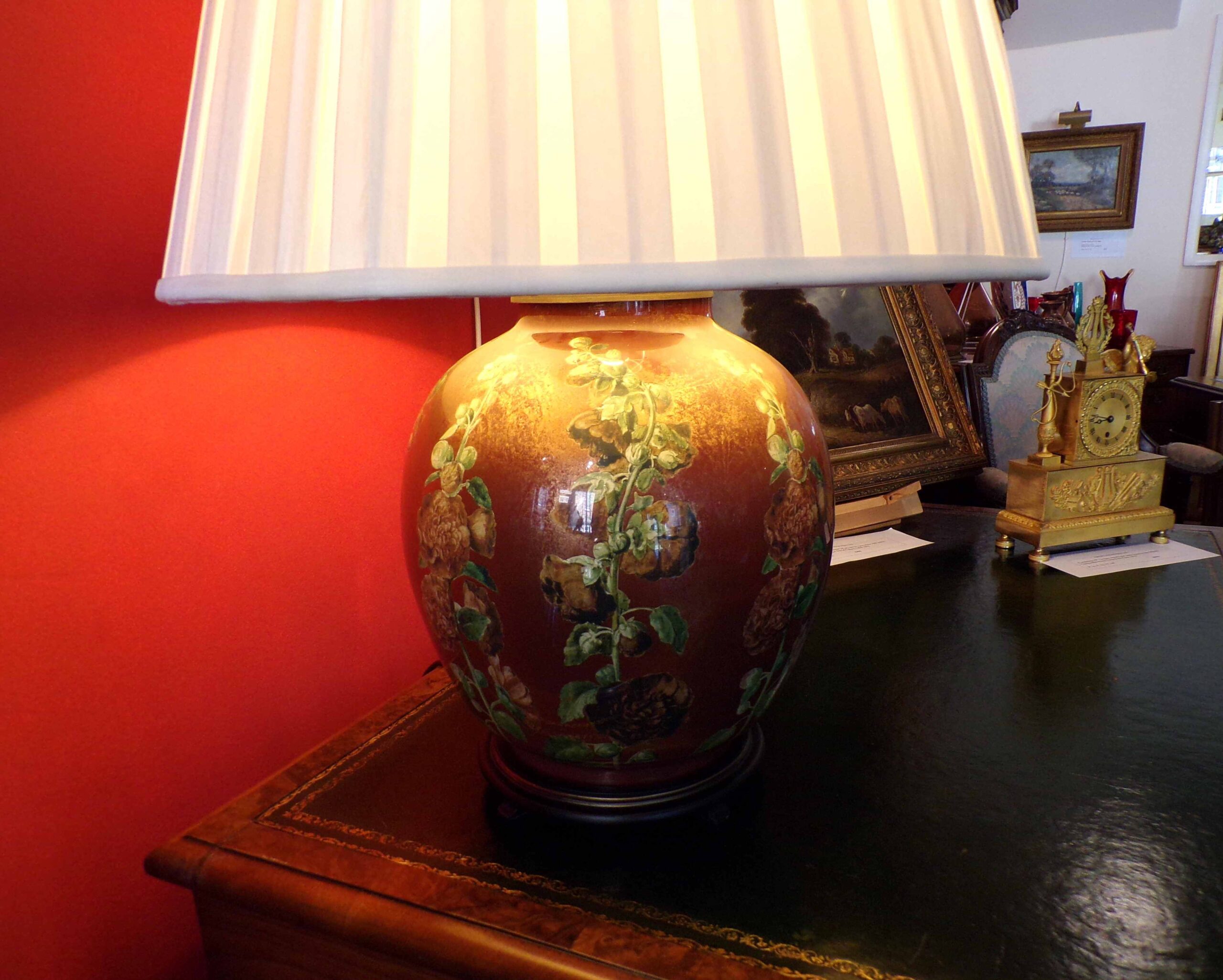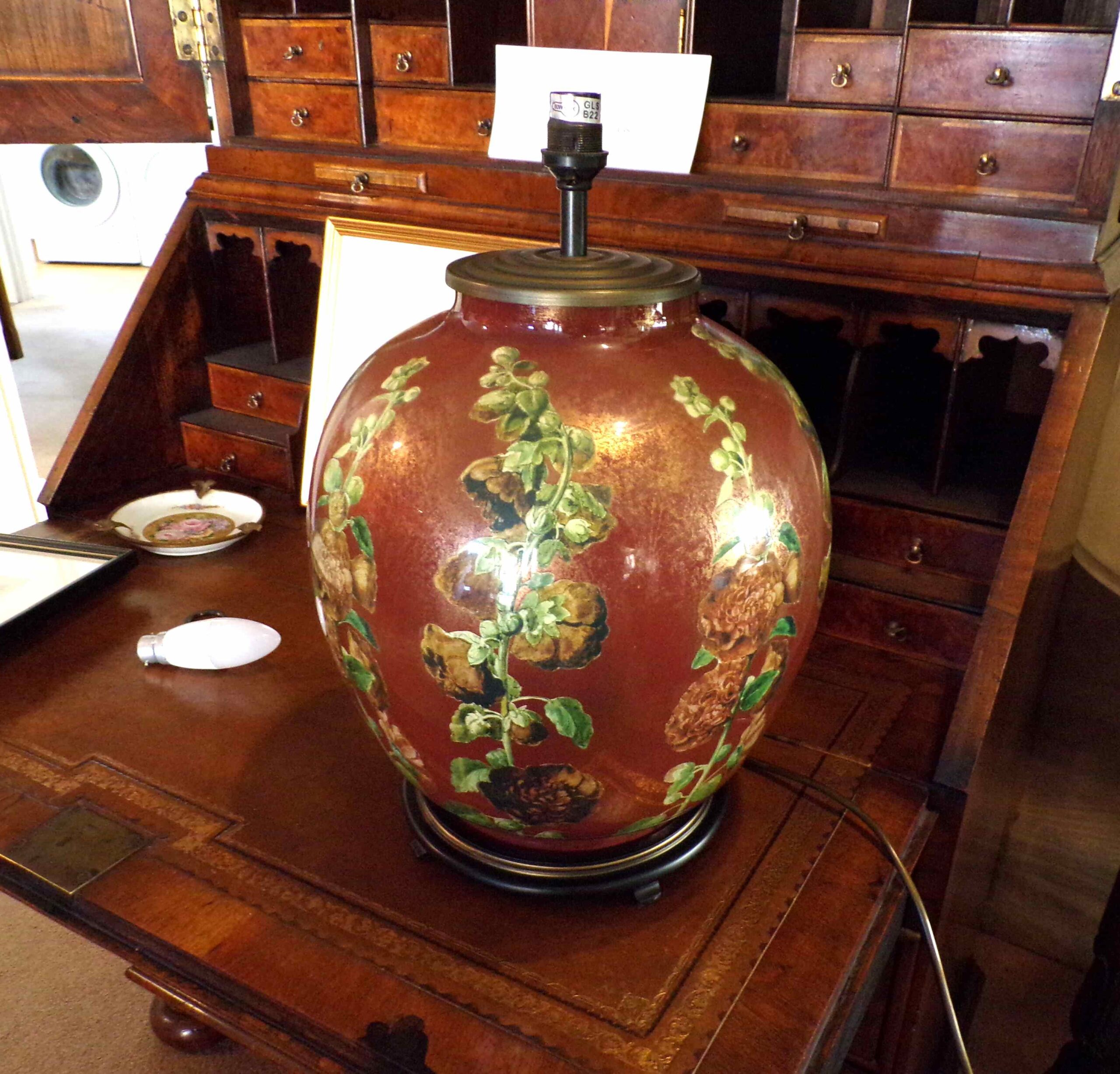 Iridescent glass hollyhocks art table lamp with gold shade (possibly Jenny Worrall)