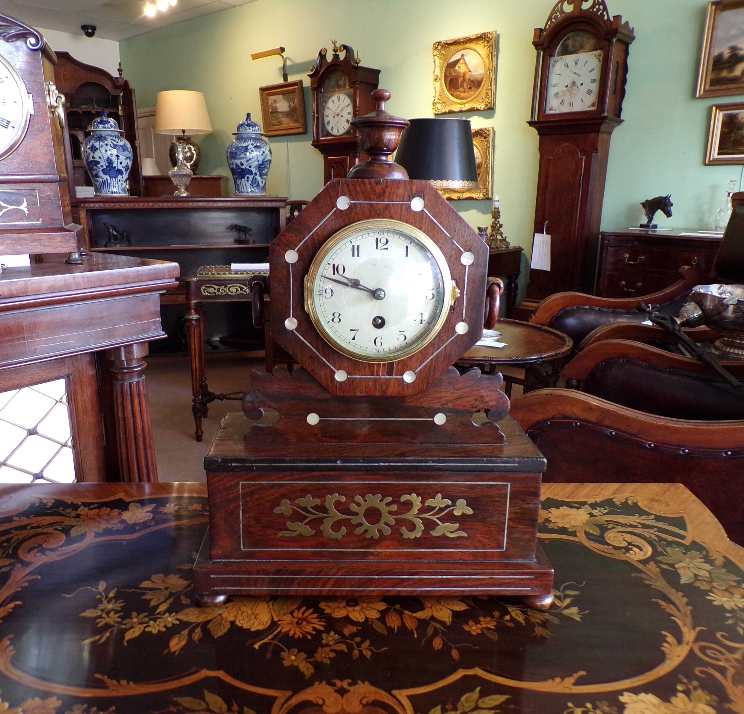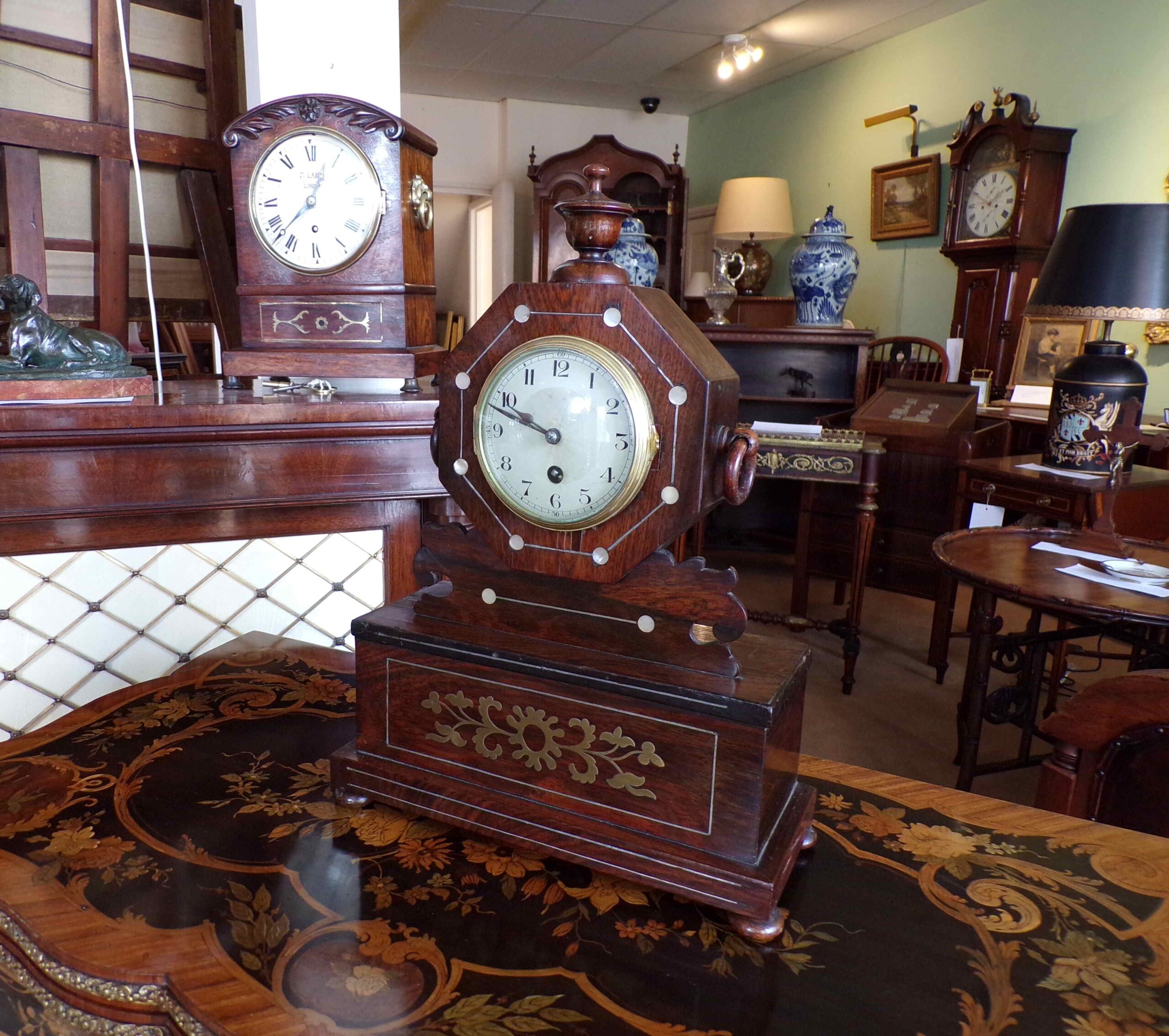 Late 19th Century rosewood, mother-of-pearl and brass inlaid table clock, eight day movement running on a reliable “platform” escapement so has the advantage of running at any angle and thus not requiring set-up