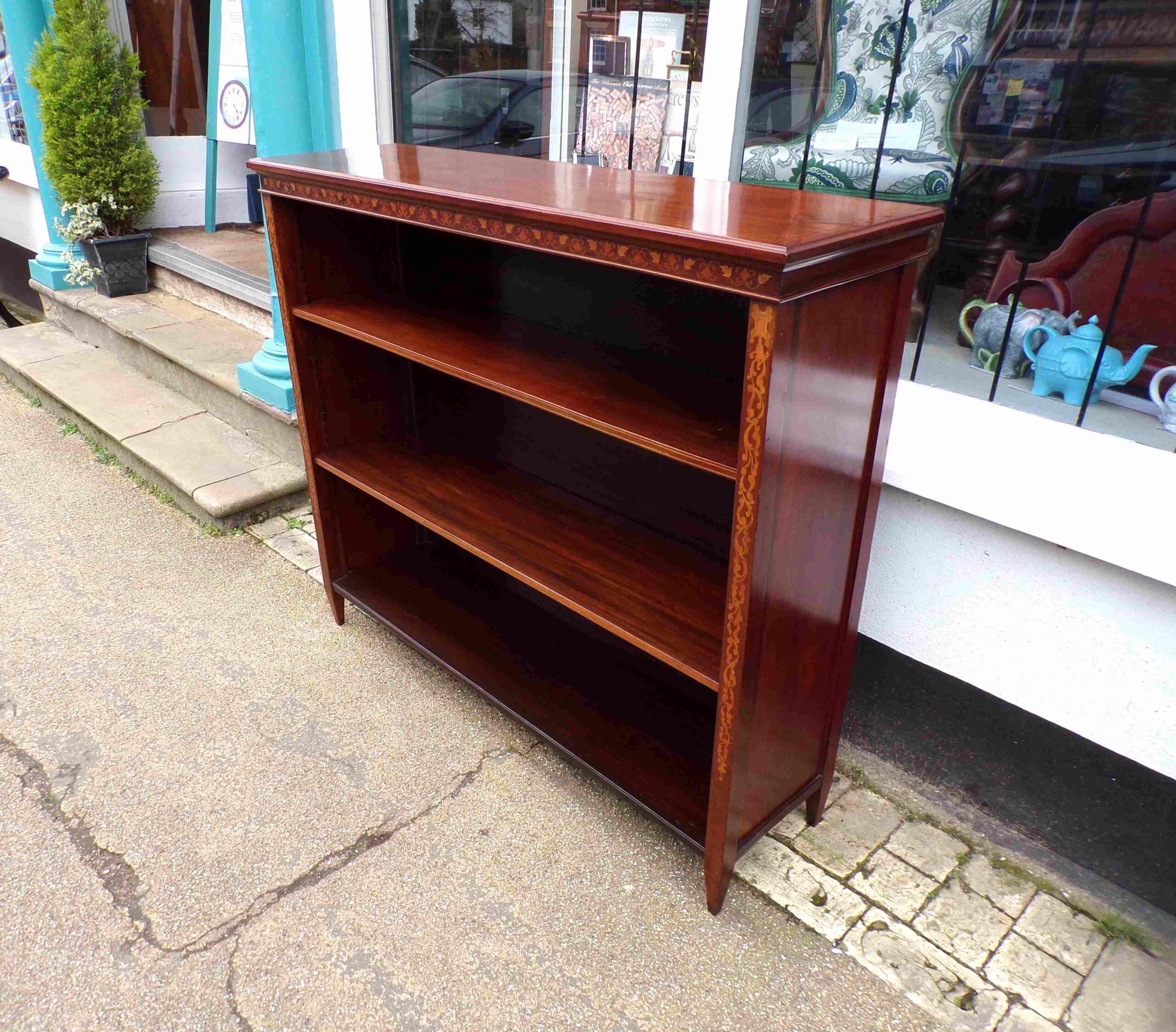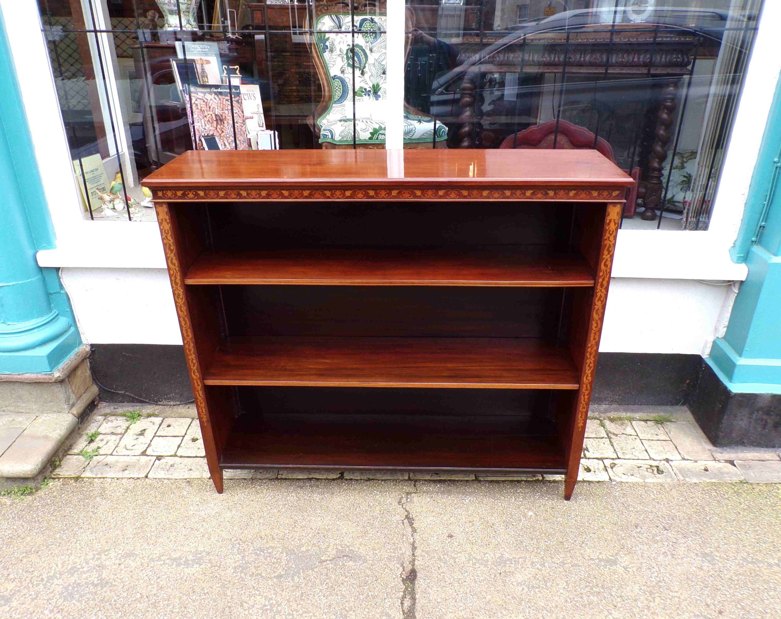 Marquetry inlaid mahogany Edwardian open bookcase with two adjustable shelves