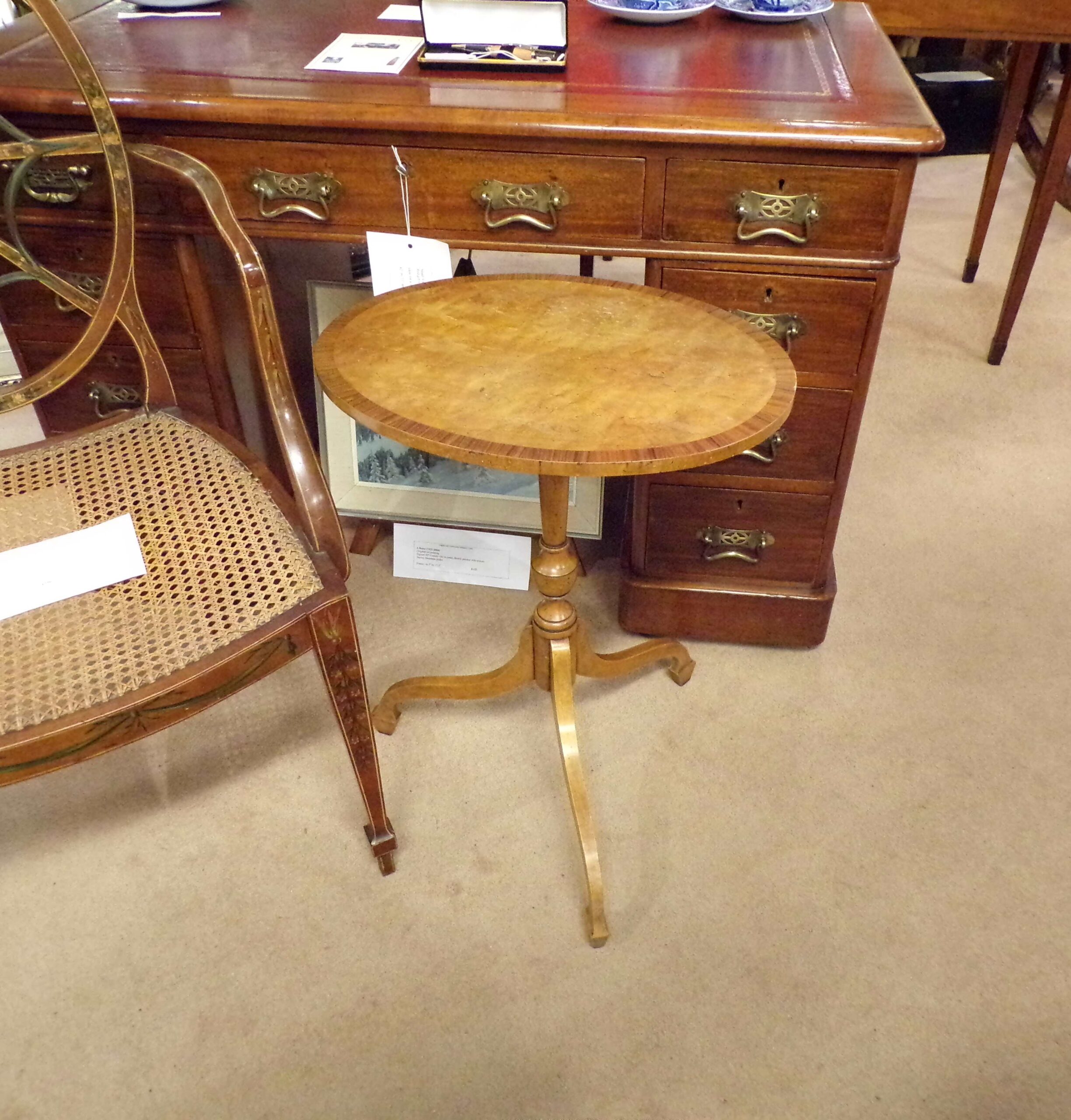 Sheraton style claw base oval birds eye maple tripod wine table with rosewood banding.
