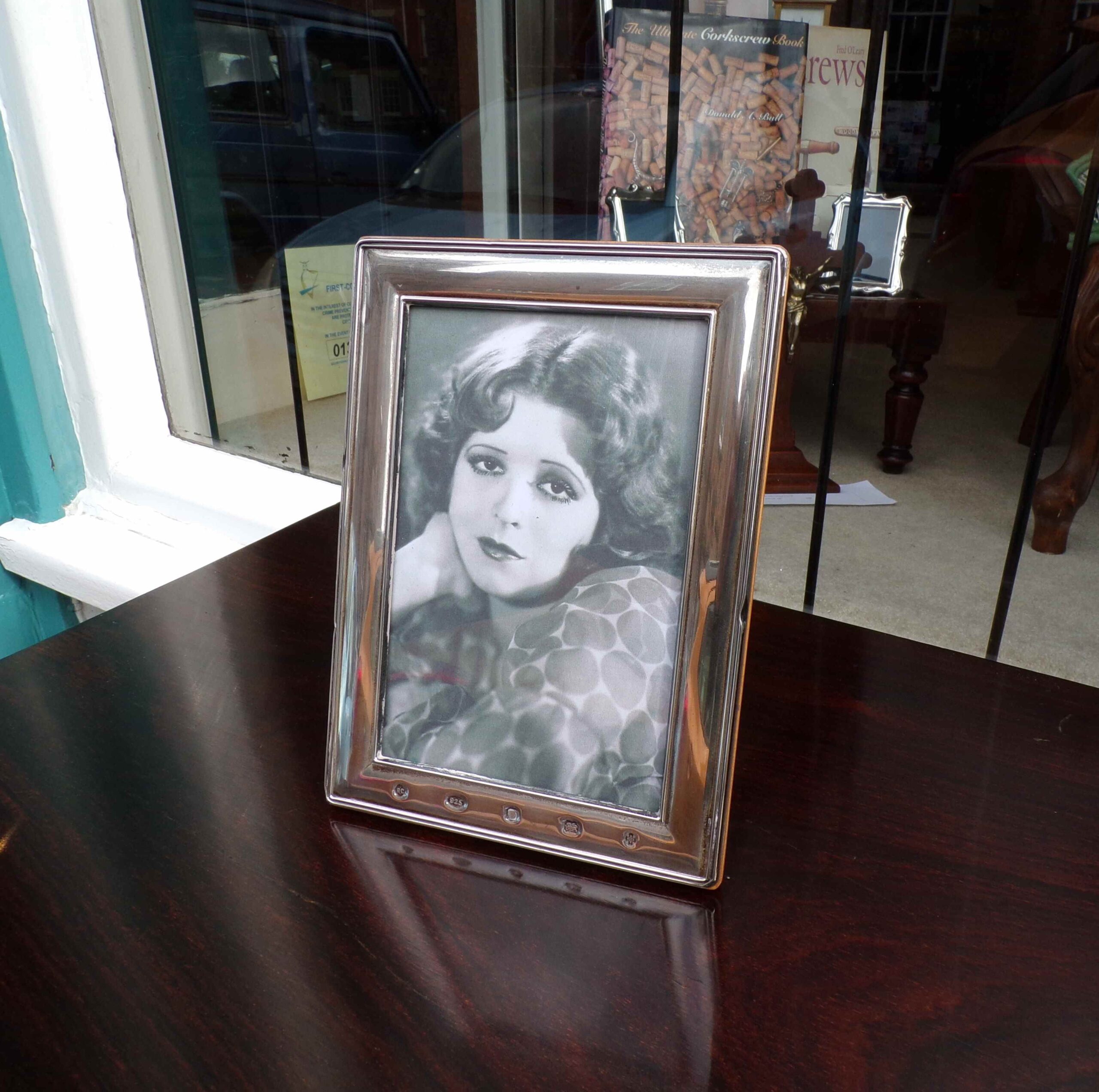 Sterling silver rectangular picture frame with feature hallmarks (wood back) 5.5″ by 7″ overall