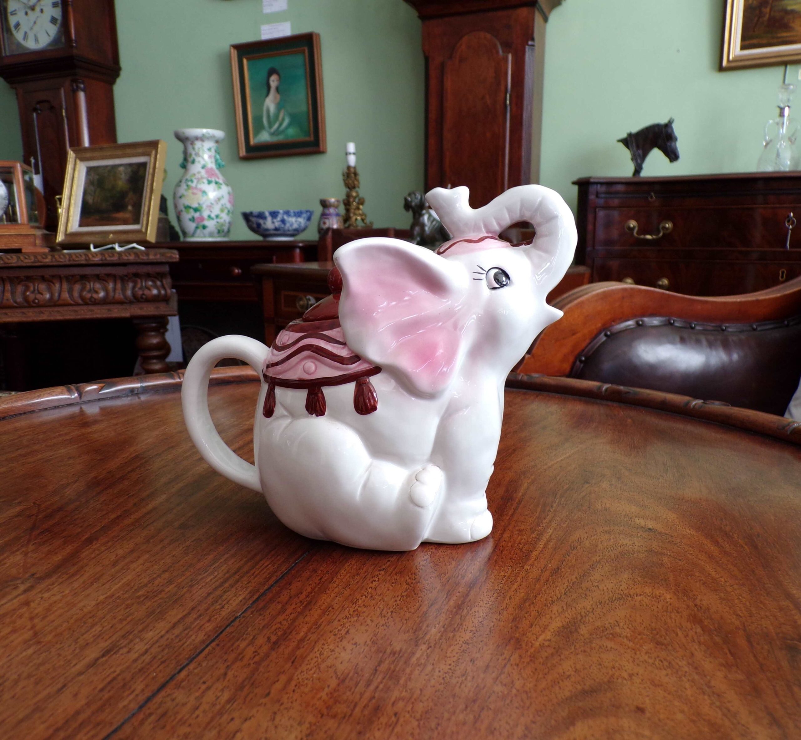 Vintage elephant teapot in pink, wine and white (7″ tall)