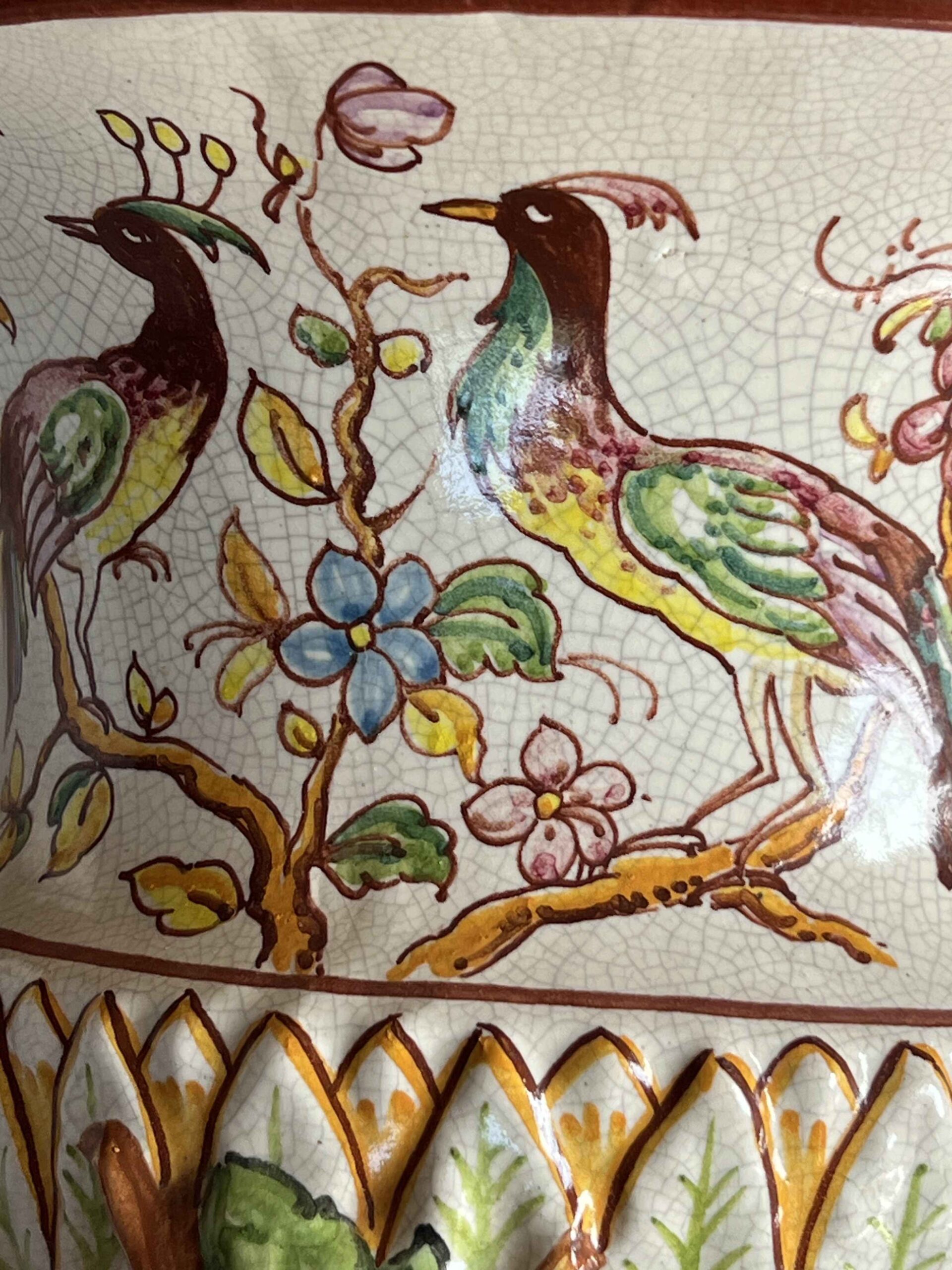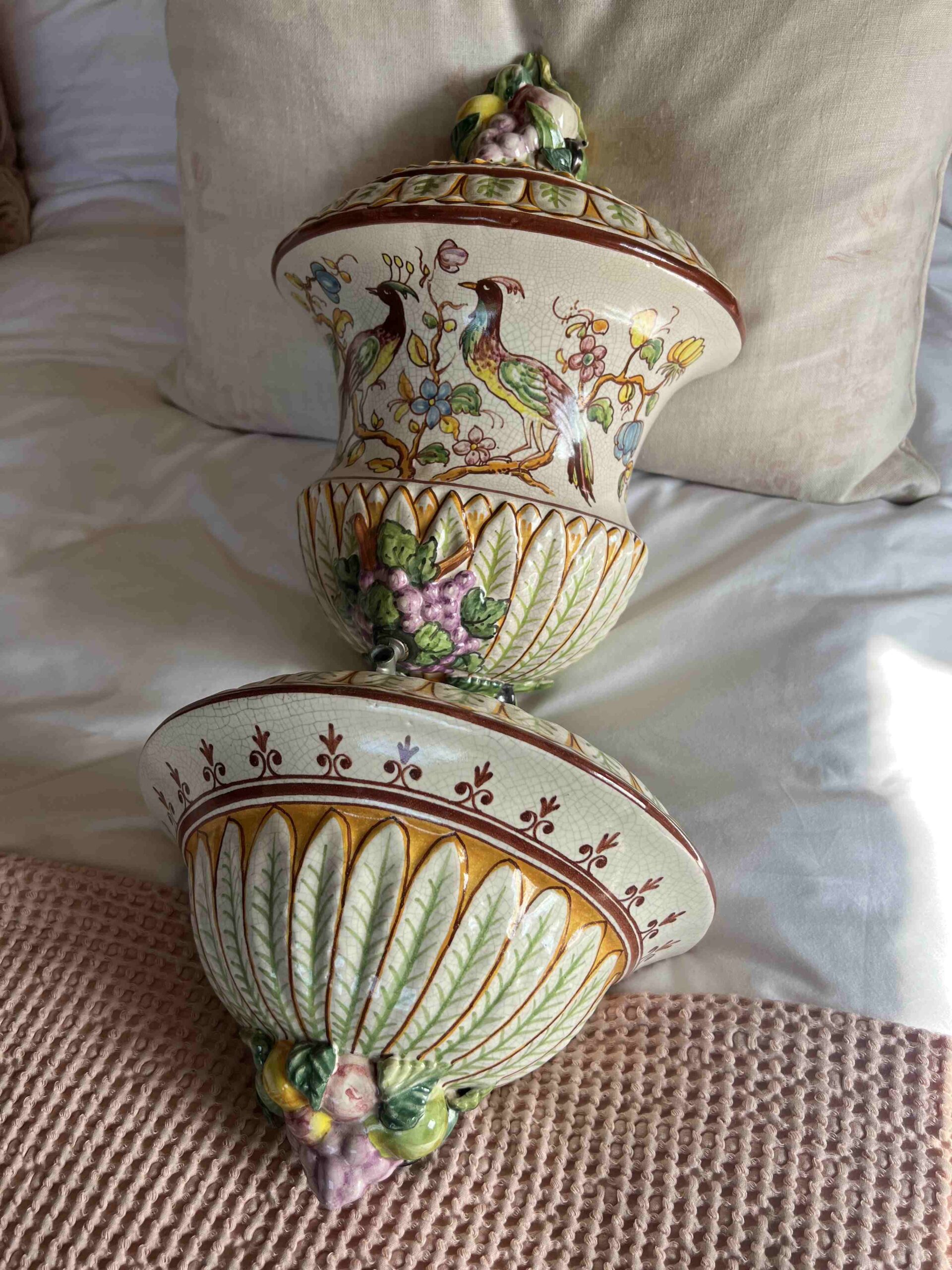 Vintage Spanish Majolica crackleur ceramic wall mounted aquamanile or hanging water fountain with collection dish